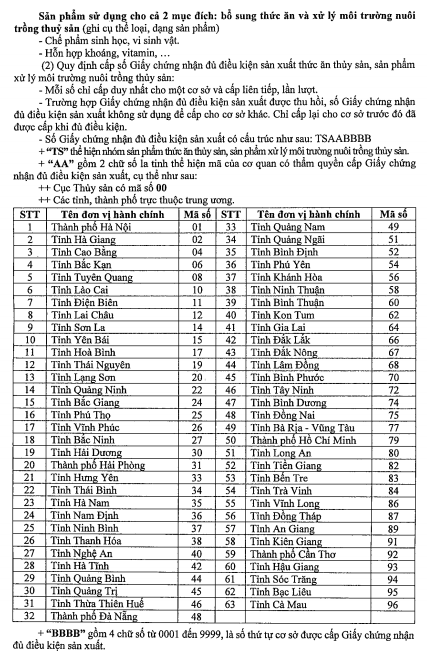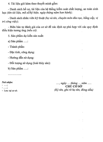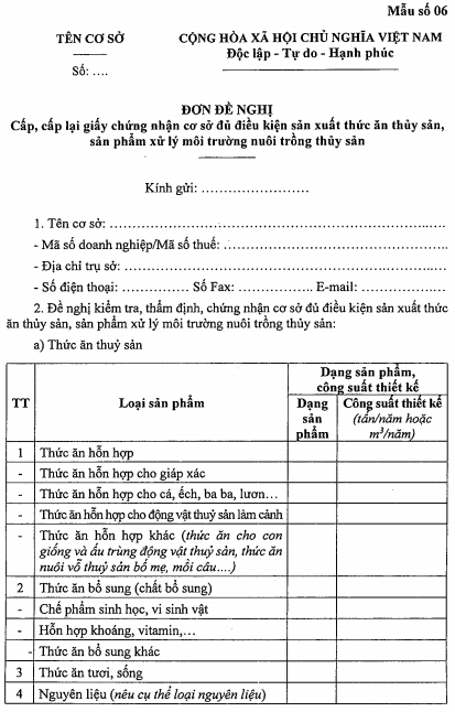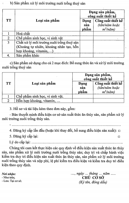 đ) Trình tự cấp lại Giấy chứng nhận đủ điều kiện sản xuất thức ăn thủy sản, sản phẩm xử lý môi trường nuôi trồng thủy sản: Cơ sở sản xuất gửi hồ sơ đến Cơ quan quản lý nhà nước về thủy sản cấp tỉnh. Trong thời hạn 03 ngày làm việc, kể từ ngày nhận được hồ sơ hợp lệ, cơ quan có thẩm quyền cấp lại Giấy chứng nhận đủ điều kiện sản xuất thức ăn thủy sản, sản phẩm xử lý môi trường nuôi trồng thủy sản theo Mẫu số 09 Phụ lục I ban hành kèm theo Nghị định số 37/2024/NĐ-CP. Trường hợp không cấp phải trả lời bằng văn bản và nêu rõ lý do.