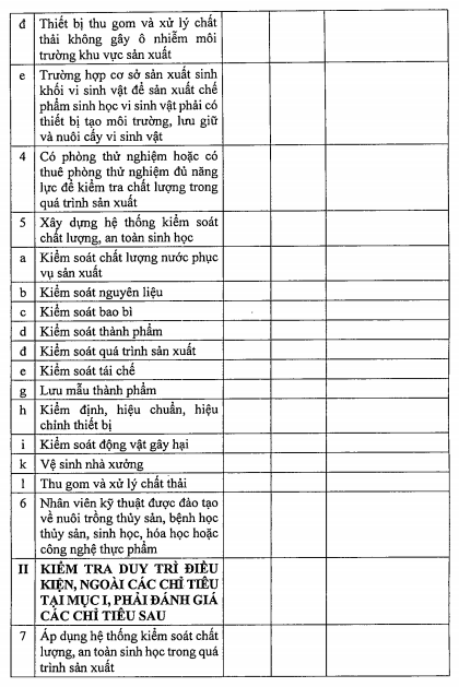 e) Nội dung kiểm tra điều kiện sản xuất thức ăn thủy sản, sản phẩm xử lý môi trường nuôi trồng thủy sản như sau: