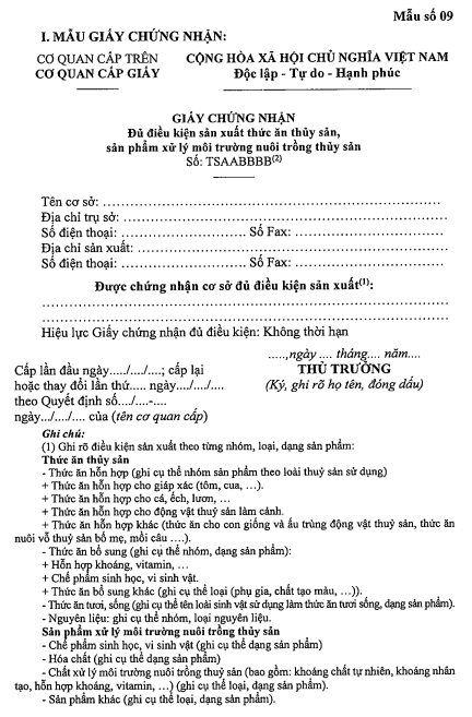 1.7. Kết quả thực hiện thủ tục hành chính: Giấy chứng nhận đủ điều kiện sản xuất thức ăn thủy sản, sản phẩm xử lý môi trường nuôi trồng thủy sản theo Mẫu số 09 Phụ lục I ban hành kèm theo Nghị định số 37/2024/NĐ-CP.