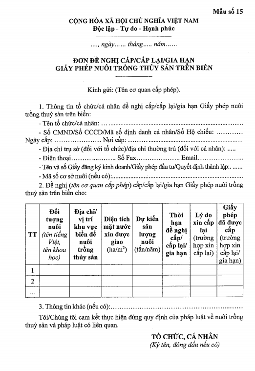 - Tổ chức, cá nhân gửi đề nghị cấp lại Giấy phép theo Mẫu số 15 Phụ lục I ban hành kèm theo Nghị định số 37/2024/NĐ-CP đến Cơ quan quản lý nhà nước về thủy sản cấp tỉnh;