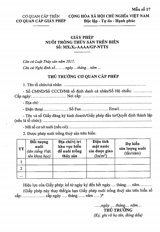 1.7. Kết quả thực hiện thủ tục hành chính: Giấy cấp phép nuôi trồng thủy sản trên biển.