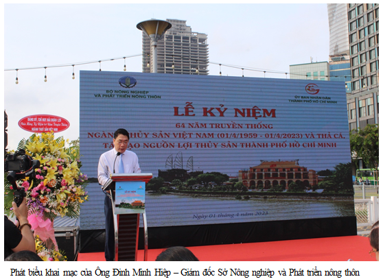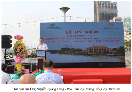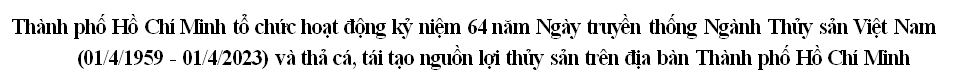 Ngày 01/4/2023, tại Ga tàu thủy Bạch Đằng, số 10B, đường Tôn Đức Thắng, phường Bến Nghé, Quận 1, Thành phố Hồ Chí Minh, Ủy ban nhân dân Thành phố phối hợp Bộ Nông nghiệp và Phát triển nông thôn tổ chức Lễ Kỷ niệm 64 năm Ngày truyền thống ngành Thủy sản Việt Nam (01/4/1959 - 01/4/2023) và thả cá, tái tạo nguồn lợi thủy sản Thành phố Hồ Chí Minh.