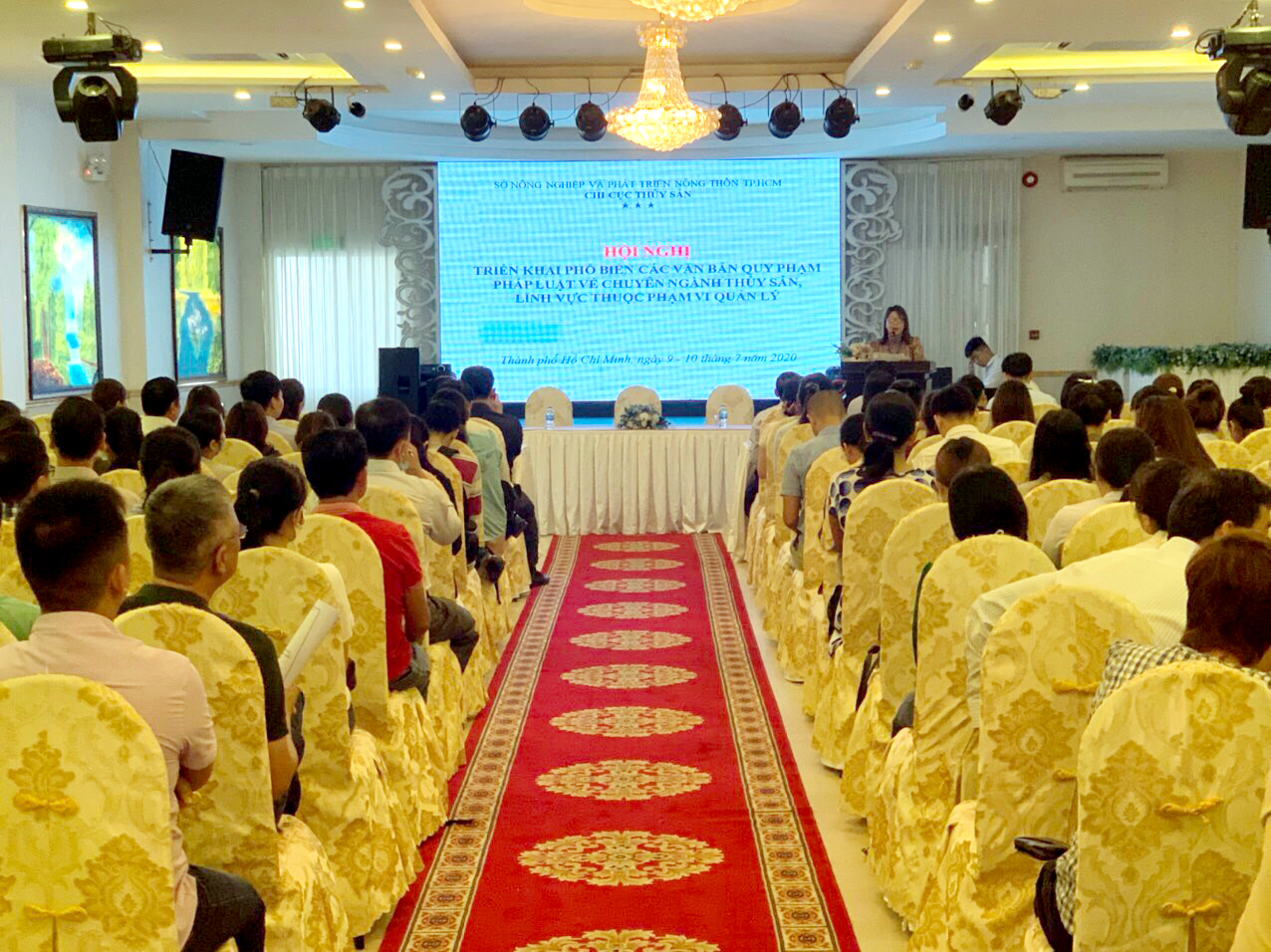 Nhằm mục đích tuyên truyền, phổ biến các văn bản quy phạm pháp luật về chuyên ngành Thủy sản, lĩnh vực thuộc phạm vi quản lý cho các cơ sở hoạt động trong lĩnh vực sản xuất vật tư thủy sản, các cơ sở sản xuất thức ăn thủy sản, sản phẩm xử lý môi trường nuôi trồng thủy sản. Ngày 10/7/2020, Chi cục tổ chức Hội nghị phổ biến các văn bản quy phạm pháp luật trong lĩnh vực sản xuất, kinh doanh vật tư thủy sản nhằm tuyên truyền, phổ biến những quy định mới. Đến tham dự có gần 170 đại diện các cơ sở sản xuất, kinh doanh cá cảnh, thức ăn thủy sản, sản phẩm xử lý môi trường nuôi trồng thủy sản trên địa bàn thành phố Hồ Chí Minh.