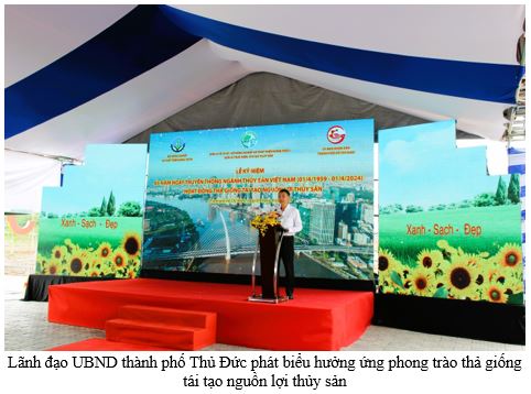 Nhằm hưởng ứng phong trào thả giống tái tạo nguồn lợi thủy sản trên địa bàn Thành phố, ông Nguyễn Bạch Hoàng Phụng - Phó chủ tịch UBND thành phố Thủ Đức, thay mặt chính quyền cơ sở phát biểu trong buổi lễ hôm nay. Theo ông Phụng, trong những năm qua, cấp ủy, chính quyền thành phố Thủ Đức thường xuyên chỉ đạo 34 phường cùng hệ thống chính trị cơ sở tổ chức ra quân thực hiện ngày chủ nhật xanh, khơi thông dòng chảy kênh, rạch trên địa bàn, đây cũng là một trong những giải pháp về cải thiện môi trường nước tạo điều cho các loài thủy sản sinh sôi và phát triển trong hệ thống sông ngòi trên địa bàn thành phố; phối kết hợp các đơn vị doanh nghiệp trên địa bàn tổ chức các chương trình đổi rác thải nhựa lấy nhu yếu phẩm thiết yếu cho nhân dân trên địa bàn nhằm nâng cao nhận thức, hình thành thói quen thu gom, phân loại, tái sử dụng, tái chế chất thải nhựa để giảm thiểu chất thải nhựa ra môi trường, kênh rạch, sông ngòi; đồng thời chỉ đạo các phường phối hợp công an phường thường xuyên kiểm tra xử lý nghiêm các trường hợp sử dụng xung điện, kích điện khai thác thủy sản trên địa bàn; thông qua Mặt trận Tổ quốc cùng các đoàn thể vận động các doanh nghiệp, Ban Trị sự Giáo hội Phật giáo Thành phố hưởng ứng chương trình thả giống tái tạo nguồn lợi thủy sản trên địa bàn thành phố thông qua các đợt phóng sinh các loài thủy sản trong các dịp lễ hội Phật giáo hàng năm.