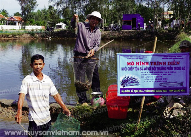 Điển hình là mô hình nuôi ghép tôm sú với cá đối tại hộ anh Bùi Min, trú tại thôn Xuân An xã Tịnh Hòa (TP Quảng Ngãi), với diện tích 2.400 m2. Anh Min thả 28.800 con tôm sú, cỡ 2 - 3 cm/con (mật độ 12 con/m2) và 2.400 con cá đối, cỡ 6 cm/con (mật độ 1 con/m2); ngân sách tỉnh hỗ trợ 100% tiền giống, 30% chi phí thức ăn và hóa chất. Sau 4 tháng thực hiện, nhờ tuân thủ quy trình kỹ thuật nuôi, mô hình đạt được các chỉ tiêu theo phương án đề ra. Sản lượng tôm sú 483 kg, với giá 220.000 đồng/kg, thu trên 106 triệu đồng; sản lượng cá đối (dự kiến) 360 kg, với giá 100.000 đồng/kg, thu trên 36 triệu đồng. Tổng thu dự kiến trên 142 triệu đồng, sau khi trừ chi phí lãi trên 56 triệu đồng.