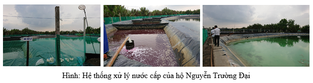 - Nước từ ngoài cấp vào ao xử lý (được lọc kỹ qua túi lọc bằng vải kate nhằm lọc bỏ bớt trứng cá, giáp xác, rác…), Nước từ kênh rạch được bơm vào ao xử lý được diệt khuẩn đồng thời khi đang bơm vào, để lắng, xả tràn qua ao chứa nhằm để lắng tụ vật chất hữu cơ lơ lững, cho trứng cá và giáp xác nở hết thành ấu trùng để dễ tiêu diệt hơn và được xử lý bằng thuốc tím.