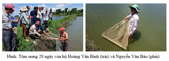 Lượng giống thả 200.000 con, mật độ thả 10 con/m2. Thời gian nuôi 04 tháng, kích cỡ tôm thu hoạch 25 con/kg. Thức ăn: 02 tháng đầu cho ăn thức ăn viên dành cho tôm thẻ (độ đạm 40%); 02 tháng sau cho ăn thức ăn tự chế (cá biển, bắp sọ, thức ăn viên). Tổng sản lượng 4 tấn trên diện tích 20.000 m2. Năng suất qui đổi đạt 2 tấn/ha. Tổng chi phí đầu tư 260 triệu (giá sản xuất 1 kg tôm càng xanh là 65 ngàn đồng/kg); Tổng thu 600 triệu (giá bán 1 kg tôm càng xanh là 150 ngàn đồng/kg). Tỷ suất lợi nhuận đạt 130% trên vốn đầu tư.