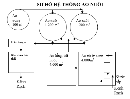 - Hệ thống ao nuôi thâm canh trong ao đất có trãi bạt bờ, bạt đáy, lưới giăng, oxy đáy, giữa ao có hố chứa bùn thải (hố gas) ( 1,5m x 1,5m x 1m ) để hút chất thải ra ngoài hàng ngày.