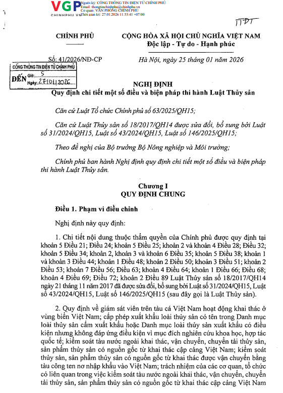 NGHỊ ĐỊNH Số: 41/2026/NĐ-CP "QUY ĐỊNH CHI TIẾT MỘT SỐ ĐIỀU VÀ BIỆN PHÁP THI HÀNH LUẬT THỦY SẢN" Tải về: Nghị định 41/NĐ-CP Nguồn: vanban.chinhphu.vn