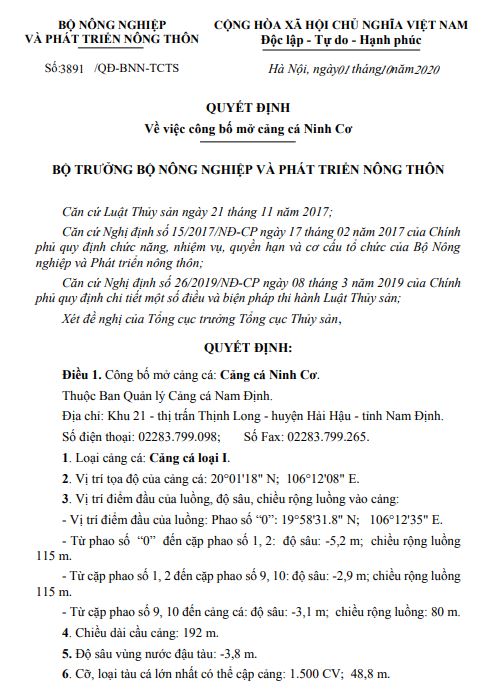 Quyết định 3891/QĐ-BNN-TCTS (Về việc công bố mở cảng cá Ninh Cơ)