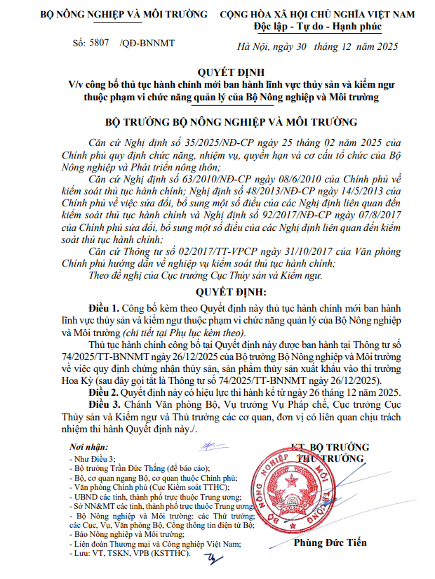 QUYẾT ĐỊNH V/v công bố thủ tục hành chính mới ban hành lĩnh vực thủy sản và kiểm ngư thuộc phạm vi chức năng quản lý của Bộ Nông nghiệp và Môi trường Tải về: Quyết định 5807/QĐ-BNNMT ngày 30 tháng 12 năm 2025 Tải về: Thông tư 74/2025/TT_BNNMT ngày 26/12/2025