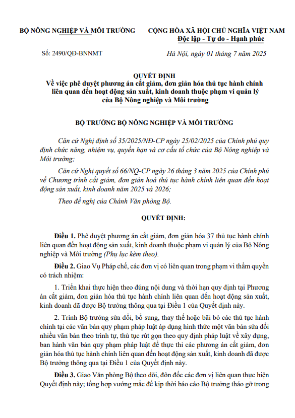 QUYẾT ĐỊNH Về việc phê duyệt phương án cắt giảm, đơn giản hóa thủ tục hành chính liên quan đến hoạt động sản xuất, kinh doanh thuộc phạm vi quản lý của Bộ Nông nghiệp và Môi trường Tải về