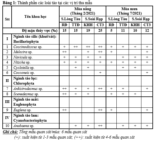 Theo Bảng 1 cho thấy sự hiện diện của các loài tảo có sự khác nhau giữa 2 thời điểm khảo sát, cụ thể các loài tảo xuất hiện nhiều hơn vào mùa nắng và ít hơn vào mùa mưa. Điều này cho thấy có sự tương đồng tỉ lệ thuận với độ mặn của thủy vực khi ghi nhận độ mặn tại các vị trí vào mùa nắng (2/2021) dao động từ 15 – 25 ‰ và mùa mưa (7/2021) dao động từ 5 – 13 ‰. Điển hình tại vị trí thu mẫu cống T3 (xã Lý Nhơn) độ mặn cao luôn cao nhất tại các thời điểm cho thấy tảo xuất hiện nhiều hơn so với các vị trí còn lại.
