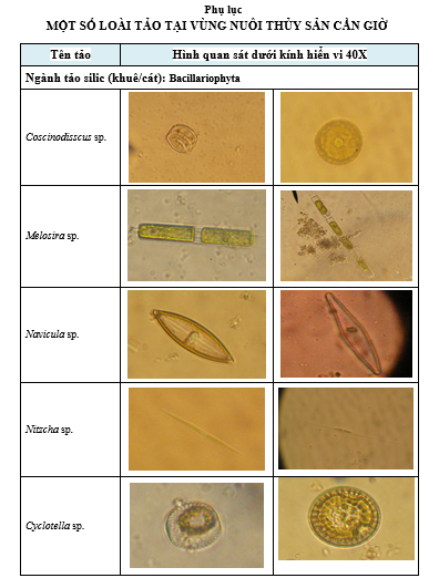 Trong quá trình thực hiện công tác thu mẫu quan trắc trong nuôi trồng thủy sản trên địa bàn huyện Cần Giờ, cán bộ kiểm nghiệm tại phòng kiểm nghiệm trạm Thủy sản An Nghĩa, Chi cục Thủy sản đã ghi nhận sự xuất hiện thường xuyên của một số loài phiêu sinh thực vật (tảo) tại một số vùng nuôi thủy sản tập trung, trong đó ngành tảo silic (Bacillariophyta) chiếm đa số với tỉ lệ 60% cấu trúc thành phần loài trên tổng số mẫu quan sát. Sự hiện diện của tảo có ý nghĩa quan trọng trong đánh giá tính đa dạng sinh học cũng như xu hướng diễn biến chất lượng nước của thủy vực, góp phần tích cực trong nhiệm vụ quản lý chuyên môn của đơn vị.
