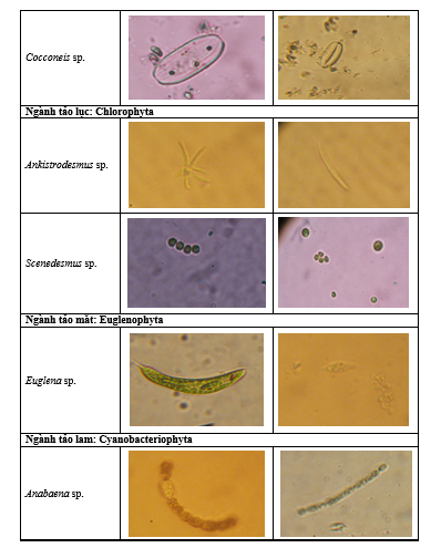 Kết quả khảo sát ghi nhận sự hiện diện của 10 loài trong 4 ngành: Vi khuẩn Lam (Cyanophyta), tảo Silic (Bacillariophyta), tảo Lục (Chlorophyta), tảo Mắt (Euglenophyta). Trong đó ngành tảo silic chiếm đa số với tỉ lệ 60% trong cấu trúc thành phần cả trong hai mùa, kế đến là tảo lục chiếm 20%, hai nhóm tảo lam và tảo mắt cùng được ghi nhận ở mức 10%. (Bảng 1).