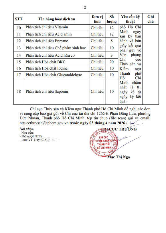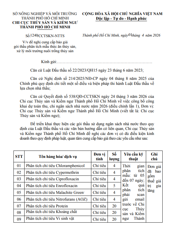 Thông báo "V/v đề nghị cung cấp báo giá gói thầu phân tích mẫu thức ăn thủy sản, xử lý môi trường nuôi trồng thủy sản" Nguồn: Chi cục Thủy sản và Kiểm ngư.