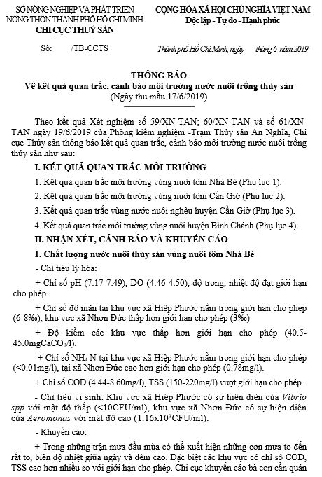 THÔNG BÁO Về kết quả quan trắc, cảnh báo môi trường nước nuôi trồng thủy sản (Ngày thu mẫu 17/6/2019) Tải về bản đủ