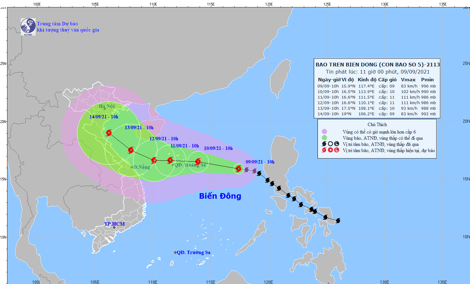 Dự báo trong 24 giờ tới, bão di chuyển theo hướng Tây Tây Bắc, mỗi giờ đi được khoảng 15km và có khả năng mạnh thêm. Đến 10 giờ ngày 10/9, vị trí tâm bão ở khoảng 16,5 độ Vĩ Bắc; 113,9 độ Kinh Đông, cách quần đảo Hoàng Sa khoảng 180km về phía Đông. Sức gió mạnh nhất vùng gần tâm bão mạnh cấp 10 (90-100km/giờ), giật cấp 12.
